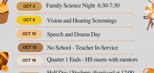 09.28.2025 | No CommentsOctober 3 – Family Science Night 6:30-7:30October 9 – Vision and Hearing ScreeningsOctober 10 – Speech and Drama DayOctober 13 – No School | Teacher In-Service DayOctober … Continue Reading